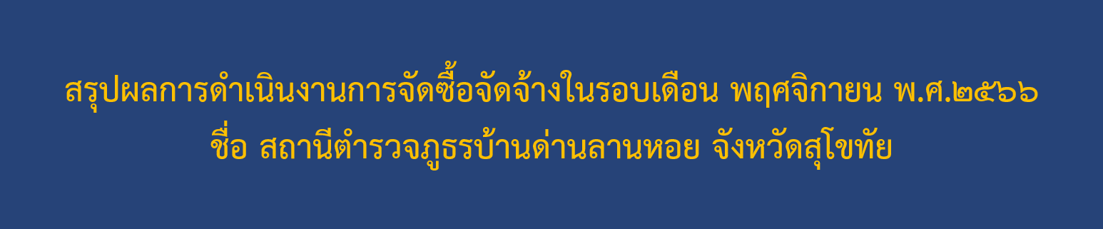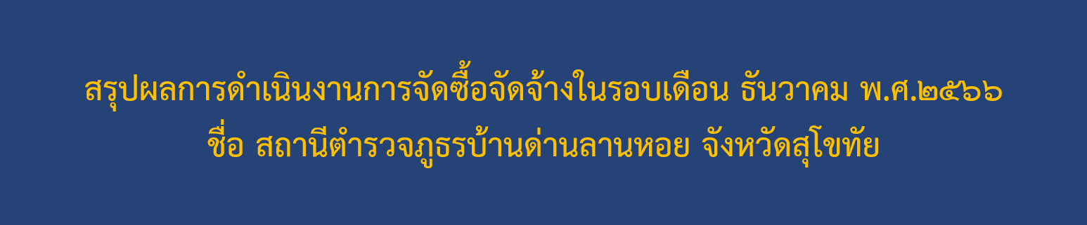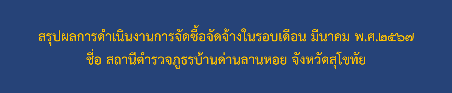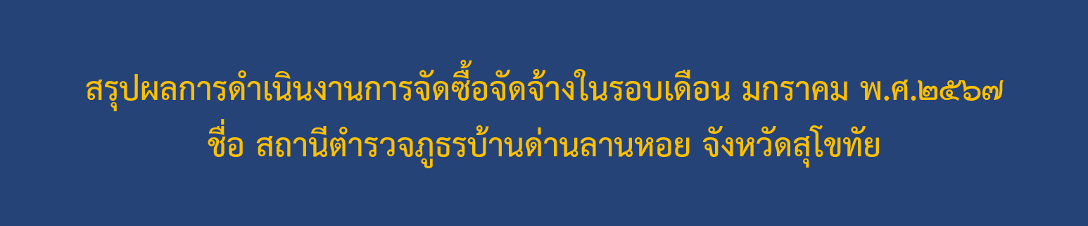 สถานีตำรวจภูธรบ้านด่านลานหอย ได้สรุปผลการดำเนินการจัดซื้อจัดจ้าง (สขร.1) ประจำเดือน โดยมีข้อมูลรายละเอียดผลการจัดซื้อจัดจ้าง ได้แก่ งานที่ซื้อหรือจ้างวงเงินที่ซื้อหรือจ้าง ราคากลาง วิธีการซื้อหรือจ้าง รายชื่อผู้เสนอราคาและราคาที่เสนอ ผู้ได้รับกำรคัดเลือกและราคาที่ตกลง เหตุผลที่คัดเลือกโดยสรุป เลขที่และวันที่ของสัญญา หรือข้อตกลงในการซื้อหรือจ้าง โดยจำแนกข้อมูลเป็นรายเดือน เผยแพร่เป็นประจำทุกเดือน ช่วง 6 เดือนแรกของปีงบประมาณ พ.ศ. 2567 มีรายละเอียดดังปรากฏด้านล่างนี้